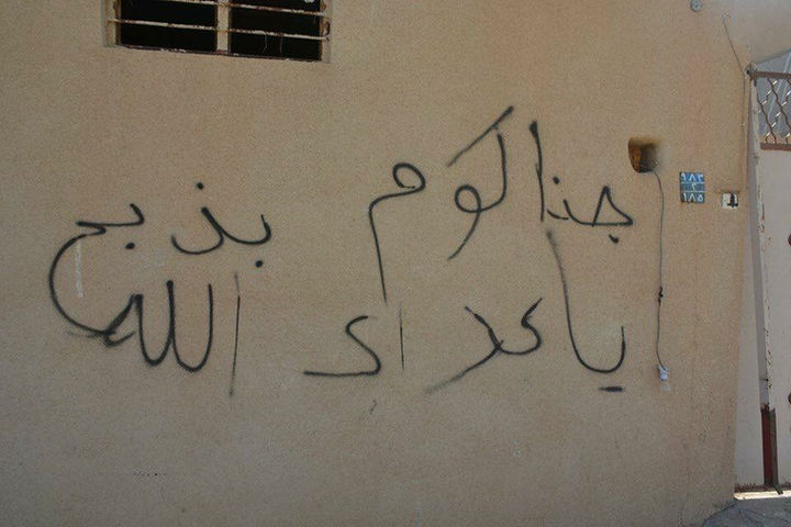 [Evidence of genocidal intent] ISIS writing on a Christian home in Qaraqosh. It says "Come to slaughter you O enemies of God" (Photo...