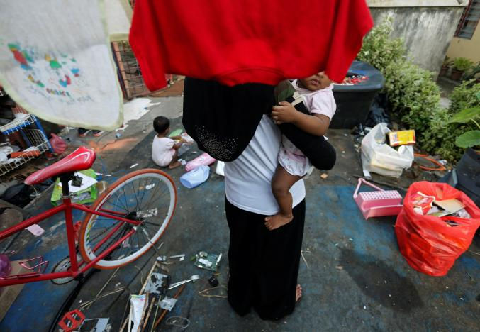 A Rohingya child bride who ran away from her husband carries her sister outside a shack she shares with her mother and siblings, on the outskirts of Kuala Lumpur, Malaysia, February 9, 2017. REUTERS/Lai Seng Sin